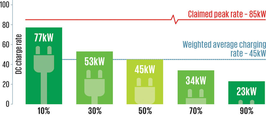 Verified DC rapid charging performance was less impressive but far from deal-breaking; most encouraging, interestingly, for users who will regularly rapid-charge to 100%, with the car maintaining better charging speeds than rivals at higher states of charge.