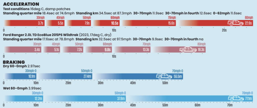 This isn’t a pick-up we would choose to do particularly heavy towing work with – not at anything close to the national speed limit, that is. Its standard-fit all-terrain tyres delivered respectable dry-surface stopping distances but didn’t make for great retardation on MIRA’s wet surfaces. Here, even allowing for the impact of anti-lock brakes, a 70mph-0 stopping distance of close to 80 metres is a little concerning.